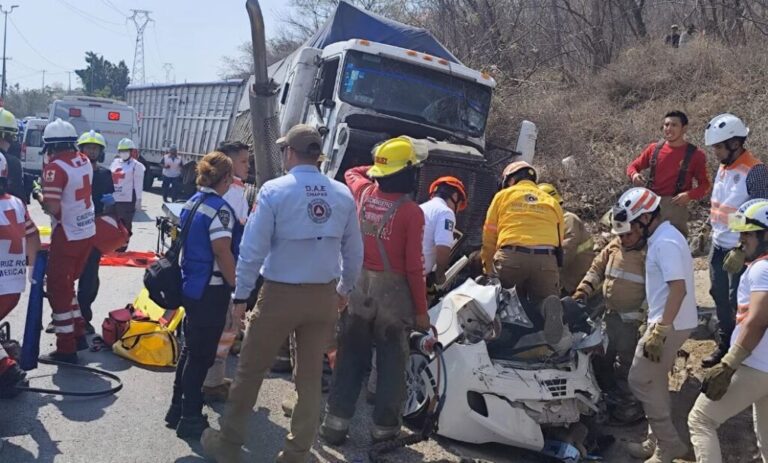 En tanto se informó que tres personas que viajaban en coche compacto , entre ellas, dos adultos y un menor de edad, fueron reportados en estado grave, al quedar aplastados o atrapados.