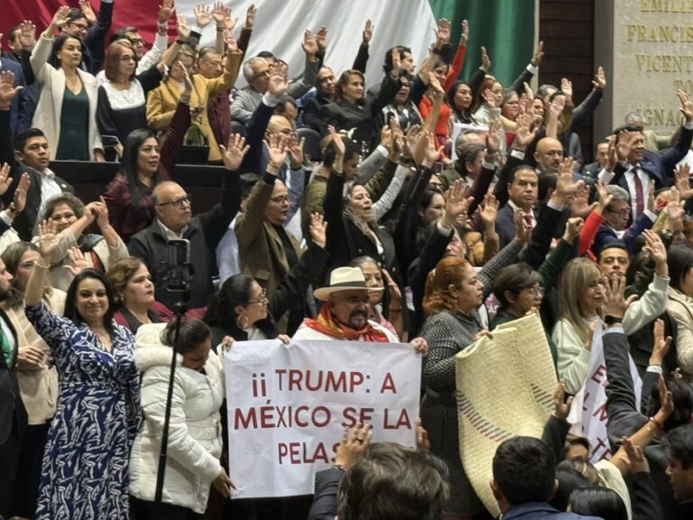 Ante las sanciones de Estados Unidos contra México, Morena y aliados tomaron la tribuna de la Cámara de Diputados para cerrar filas con la presidenta Claudia Sheinbaum con una manta con la leyenda: “Trump, a México se la pelas”.