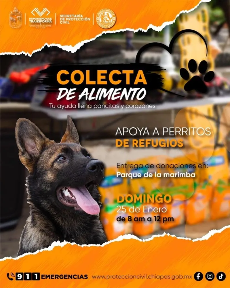 Tuxtla Gutiérrez, Chiapas; 24 de enero de 2026.- La Secretaría de Protección Civil de Chiapas, a través de la Unidad Canina de Búsqueda y Rescate, invita a la población en general a sumarse a la colecta de alimento en beneficio de perritos de refugios.