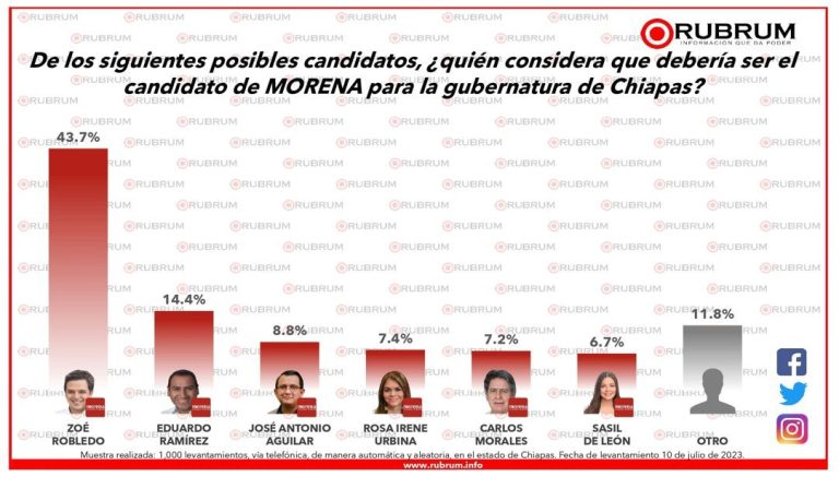 En el corte de julio de la empresa encuestadora RUBRUM, Morena mantiene una ventaja en Chiapas de hasta el 57% de intención del voto, seguido del PAN con el 11.7%, PRI con 4.9%, PVEM con 4%, Movimiento Ciudadano con 2.5% y el Partido del Trabajo con 2%.